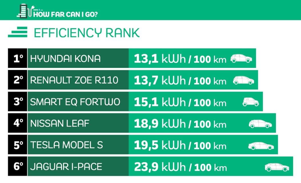 Na relativné velké auto je to skvělá hodnota. Pro zajímavost, Hyundai Kona Electric je stejně efektivní jako náš redakční Volkswagen e-Golf (test), a to je příjemná zpráva pro Hyundai. Kona tak nabízí skvělou efektivitu bez toho, aniž byste obětovali výkon vozu. Ostatní hodnoty asi nebudou velkým překvapením. Mírným zklamáním může být hodnota u Jaguaru, ale přeci jen je to nejrozměrnější zástupce z uvedených.