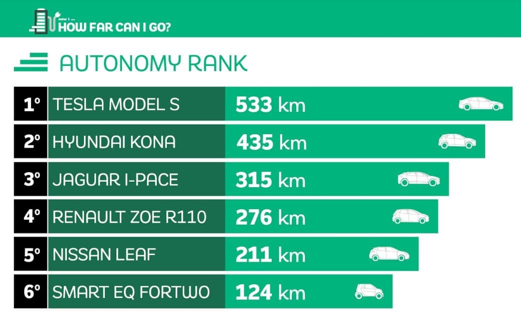 V tomto srovnání vidíme samotný dojezd jednotlivých elektrických vozů. Jsou zde samozřejmě patrné rozdíly oproti hodnotám udávanými výrobcem, ale nemyslíme si, že rozdíly jsou až tak dramatické. Pokud by se vozy testovali pouze ve městě, hodnoty by byly lepší, ale zde můžeme vidět, že i v běžném provozu se současné elektromobily neztratí. Opět výborné hodnoty má Hyundai, ale i Tesla Model S, která je však za minimálně dvojnásobnou cenu.
