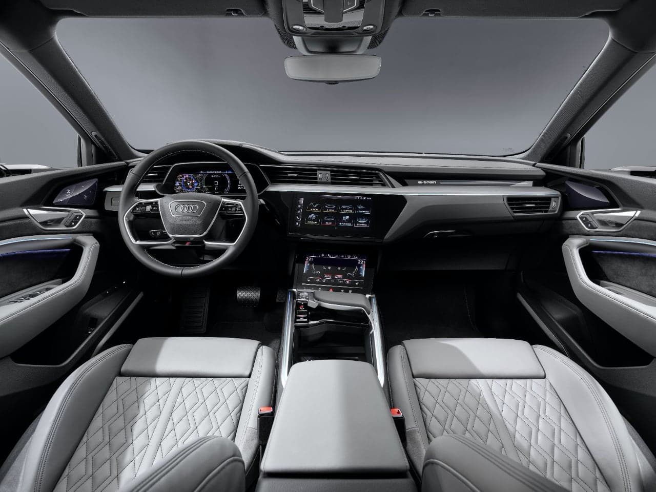 Objem zavazadlového prostoru je 615 litrů, včetně 60 litrů ve velké odkládací schránce pod přední kapotou (podobně jako u Tesly), v níž je uložena sada nářadí a nabíjecí kabel. Pokud jde o interiér, k dispozici je 12,3″ digitální panel, dále 12,1″ informační displej, který slouží i jako zábavní, telefonní i navigační systém a speciální nastavení e-tronu, nebo 8,6″ spodní displej pro vkládání textu a ovládání komfortních funkcí včetně klimatizace. Potvrzení opět probíhá pohodlně s haptickým a akustickým impulzem.