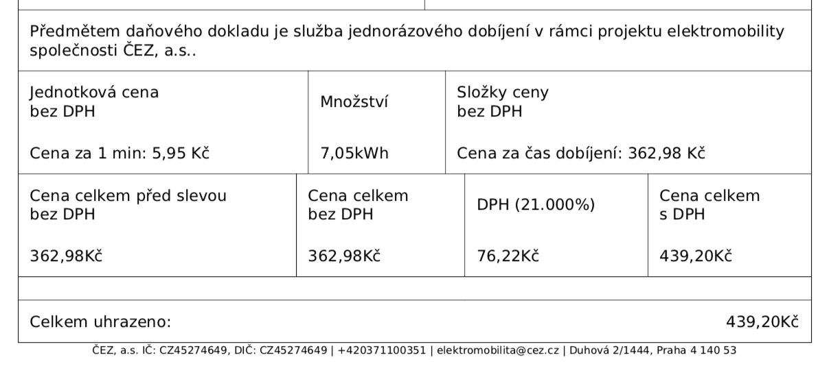 Jednou z výhod elektromobilů jsou jejich výrazně nižší provozní náklady, tedy až na některé výjimky. Díky novince společnosti ČEZ v podobě jednorázových plateb může zákazník za 1 kWh elektřiny zaplatit až 120 Kč, jak nás upozornil jeden z pravidelných čtenářů. V našem reálném případě, kdy jsme nabíjeli zhruba 1 hodinu a dobili jsme za tu dobu 7 kWh, jsme se dostali na cenu 62 Kč za 1 kWh, čili ve zkratce – podle řekněme ilustračního příkladu jsme zaplatili téměř 6x více (!), než kdybychom jezdili na pohonné hmoty. Záleží, jak dlouho nabíjíte a také jakou část baterie nabíjíte (z 0 do 80 % je to vždy rychlejší, než zbývající část). V některých případech tedy může být situace příhodnější, jindy naopak ještě šílenější. Ale to se nikde nedočtete. Dokonce ani na faktuře.
