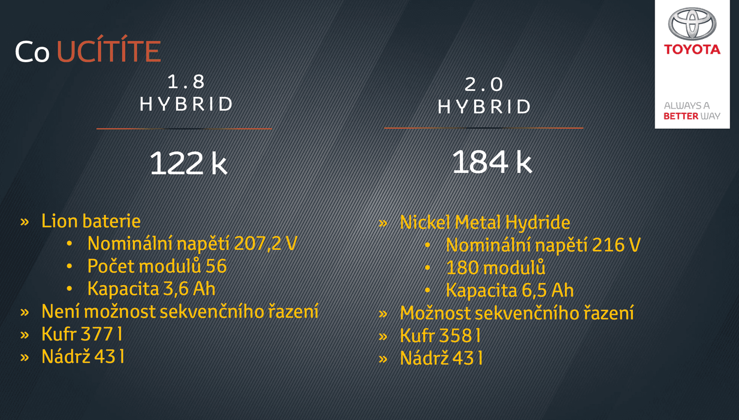 Asi největším překvapením pro nás bylo, že firma používá odlišné typy baterií a vsází nově na tzv. duální hybridní strategii. O co jde a proč se k tomu Toyota rozhodla?