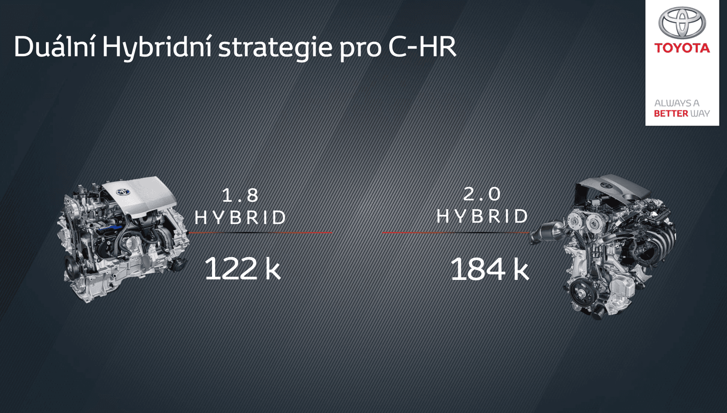 Pokud jde o duální hybridní strategii, automobilka se rozhodla nabízet novou C-HR rovnou ve dvou výkonnostních hybridních variantách – základní model 1.8 hybrid disponuje celkovým výkonem 122 koní, vyšší model 2.0 hybrid pak přináší celkem 184 koní. Motory jsou odlišné a překvapivě jsou odlišné i baterie.