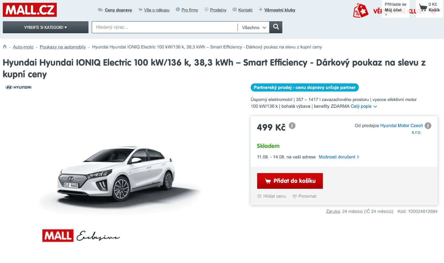 Stačí si za 500 korun pořídit na Mall.cz voucher, se kterým po dokončení nákupu uvedené verze elektromobilu u Hyundai získáte slevu na 40 000 Kč včetně DPH na nákup zboží u Mall.cz. Platnost poukazu je 6 měsíců a dodání vozu proběhne do jednoho měsíce od zakoupení.