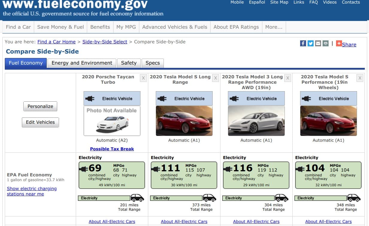 Pro srovnání, nový elektromobil Porsche Taycan, který se rozhodně může elektrovozům Tesly rovnat minimálně po stránce designu, výkonu, nebo obecně skvělých specifikací, však v nejvyšší konfiguraci s přídomkem Turbo s předpokládaným delším dojezdem ujede v kombinovaném provozu max. jen 201 mil, tj. 323 km dle měření EPA.
