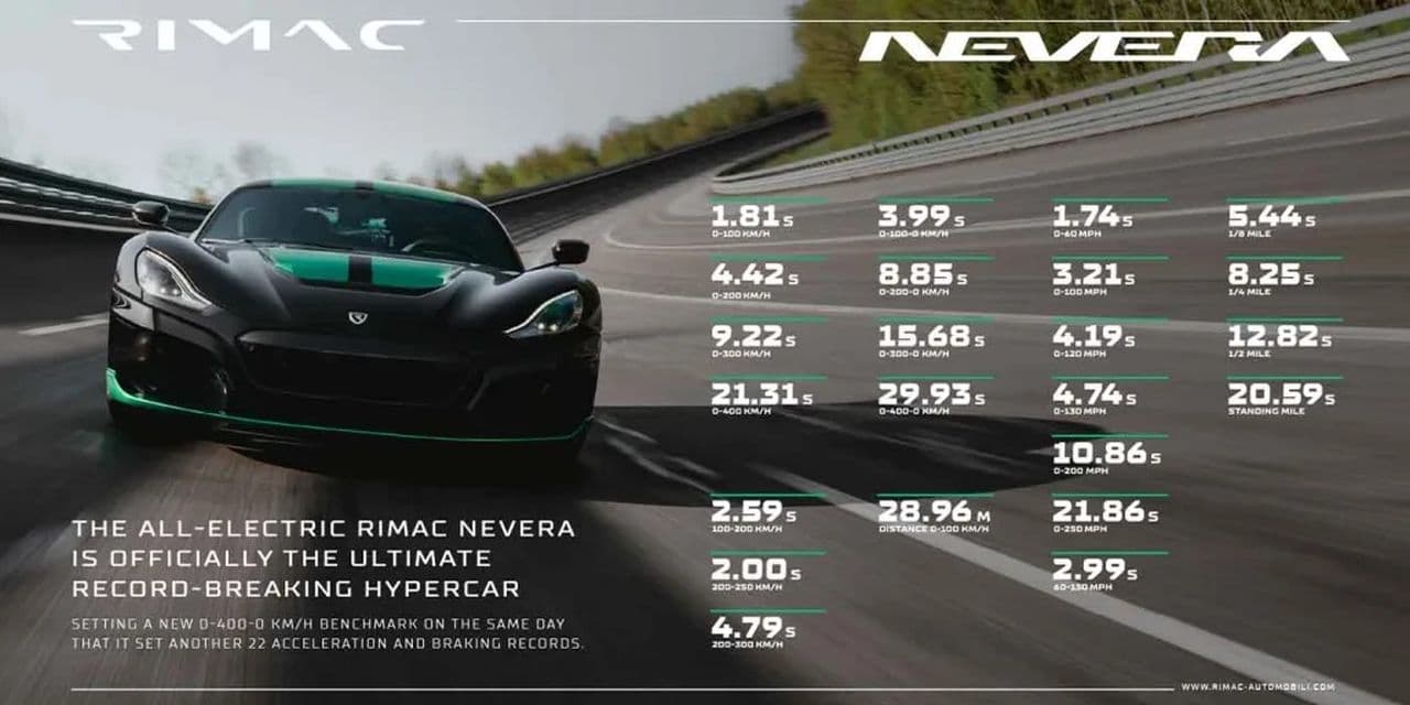 Mezi poslední rekordy Rimacu patří například zrychlení z 0 na 400 km/h za 21,31 sekund, čas na čtvrt míle, míle s pevným startem a také délka brzdné dráhy potřebná k zastavení vozu z rychlosti 100 km/h. Tým také poukazuje na to, že Nevera dokonce překonala své oficiální zrychlení z 0 na 60 mph (96,56 km/h), které mělo hodnotu 1,85 sekundy a vylepšila ji na 1,74 sekundy.