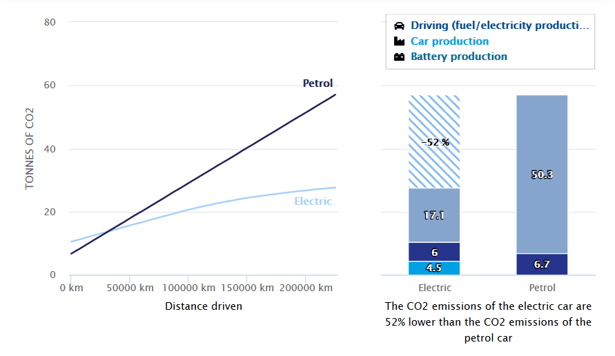 Podle nejnovějších dat evropské dopravní organizace T&E má životní cyklus srovnatelného elektrického vozu oproti benzínového 3x nižší emisní dopad. I ta nejšpinavější elektřina se zdá být menším problémem, než jsou emise při těžbě, přepravě a spalování ropy.
