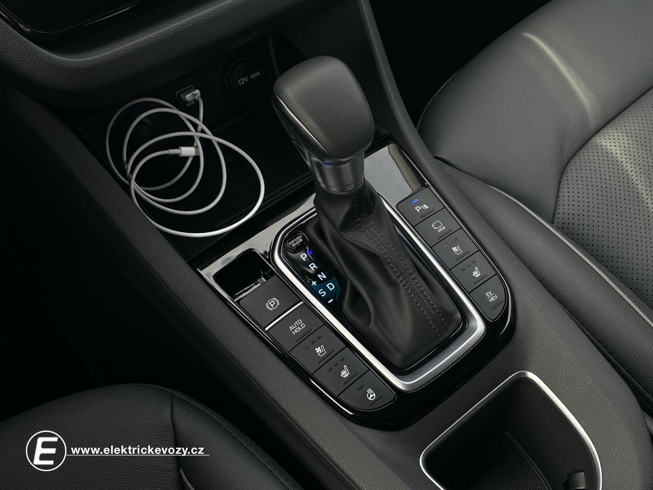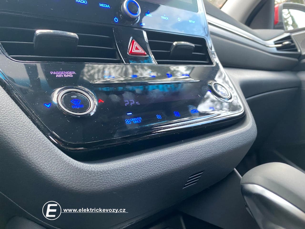 Pak tady máme tlačítko pro ovládání stupně elektrifikace pohonu, kdy můžete nechat vše zcela automaticky na autě, aby samo rozhodovalo o tom, kdy pojede na spalovací motor, kdy v hybridním režimu a kdy jen čistě na elektřinu. Ovšem háček je v tom, že ani po vynucení čistě elektrického režimu není možné, aby Hyundai jel vždy jen jako elektromobil. Stačí, že trochu víc sešlápnete pedál pro akceleraci a okamžitě se připojí i benzinový agregát. Po překročení rychlosti 120 km/hod se taktéž ke slovu přihlásí výkonnější pohonná jednotka a skončí jízda v EV režimu. Stejně tak se stane i v případě, kdy klesne úroveň baterie na 20 %, pak můžete jezdit jen v hybridním režimu a již jízdu čistě v EV režimu nemáte ve svých rukách. Můžete však docílit elektrické jízdy tím, že pojedete pomaleji a s lehkou nohou.