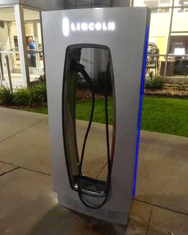 Jsou totiž nápadně podobné Superchargerům od Tesly. Ano, design je trochu odlišný, ale „nápad“ je stejný – konektor je umístěn uvnitř díry skrz tělo nabíjecí stanice. A samozřejmě se liší i barvy, Lincoln vsází na šedo-modrou kombinaci.
