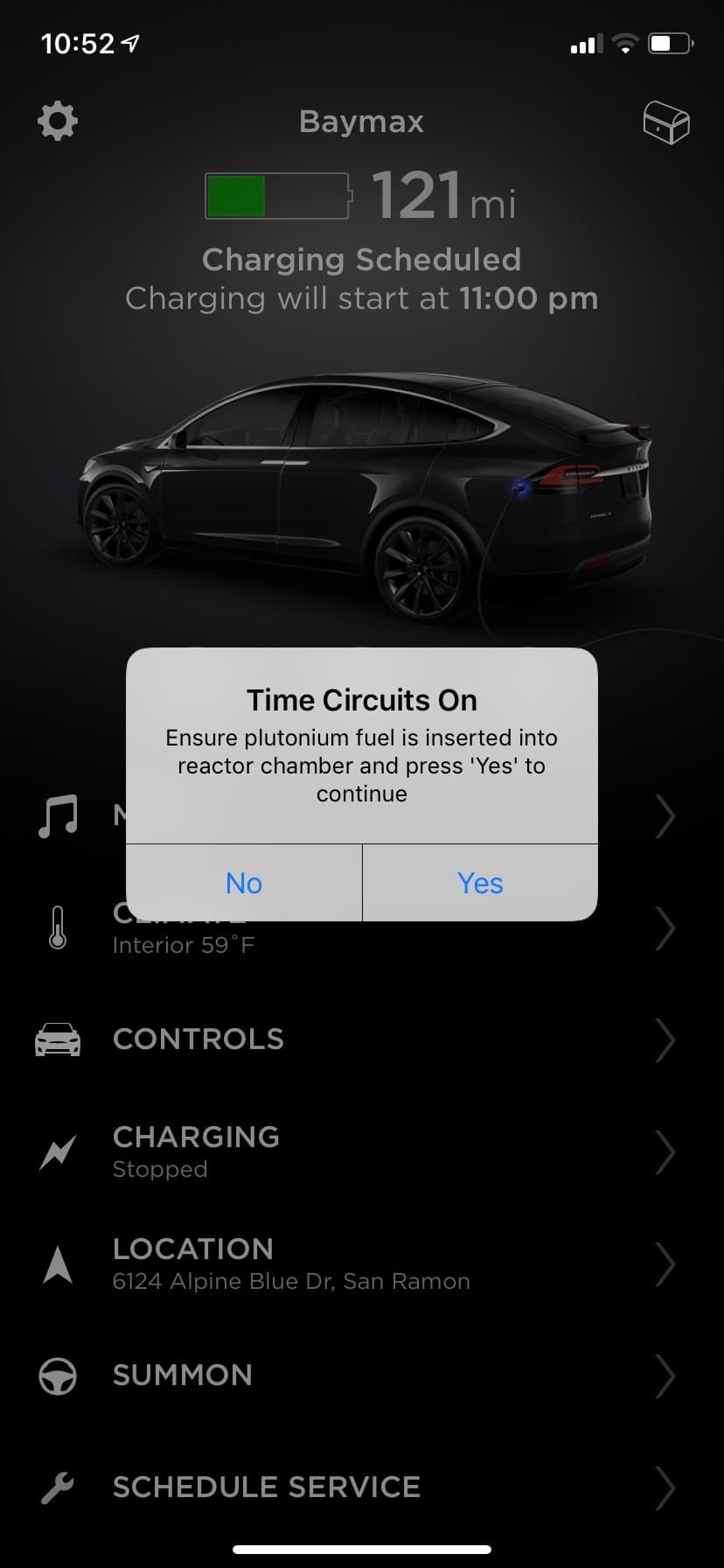 Tesla ve své mobilní aplikaci ukazuje dojezd vozu. V okamžiku, kdy je na hodnotě 121 mil stačí ťuknout prstem na symbol baterie a objeví se varování, aby uživatel zkontroloval, zdali je v reaktoru plutonium. Poté symbol baterie změní barvu na žlutou se symbolem radioaktivity.