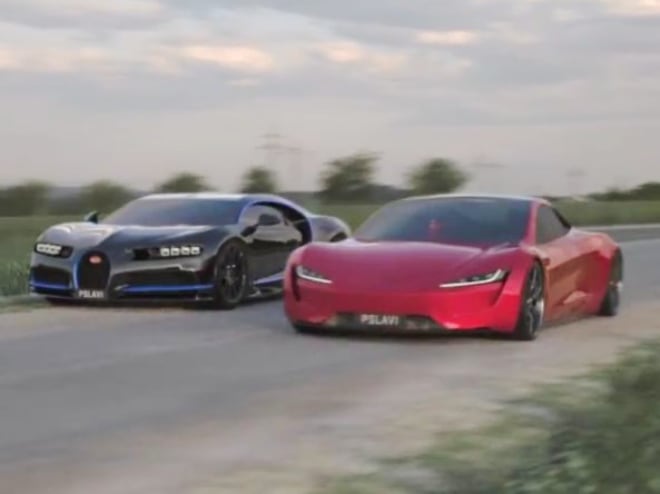 Tentokrát byl Roadster (2020) na startovní čáře postaven v simulovaném závodě proti nejrychlejšímu sériově vyráběnému autu na světě, Bugatti Chiron. Je to i takové srovnání nejrychlejšího elektromobilu vs spalovacího auta, avšak zatím ještě ne přímo na silnici. O vítězi při dragsterovém závodě a tedy zrychlení z 0 na 100 km/hod ani tentokrát netřeba dlouho přemýšlet, je to opět elektromobil Tesly.