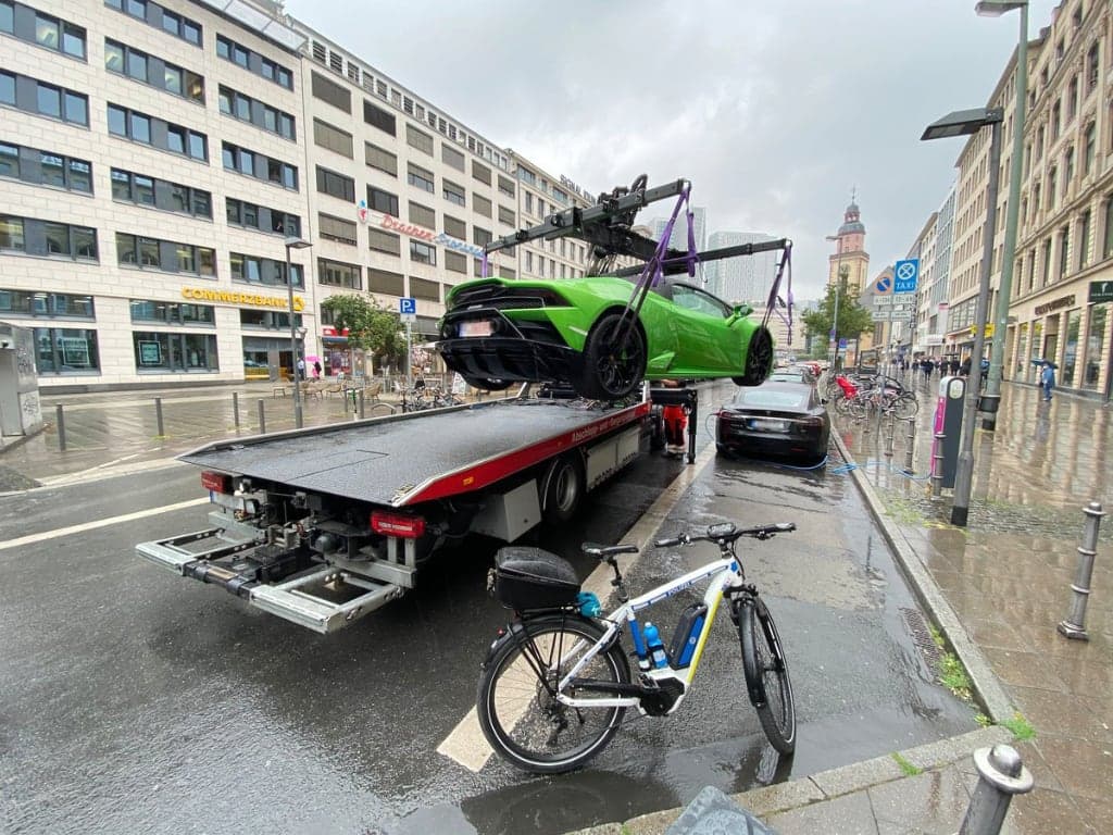Nejnovější případ se odehrál ve Frankfurtu, kde na místě vyhrazeném pro elektromobily stálo Lamborghini Huracan Evo Spyder, které zde samozřejmě nemá co dělat. Že by si majitel vozu myslel, že když má zelené auto, že mu to projde? Nevíme, každopádně policista, který přijel na elektrokole, okamžitě zavolal odtahovku a ta už si se spalovákem poradila.
