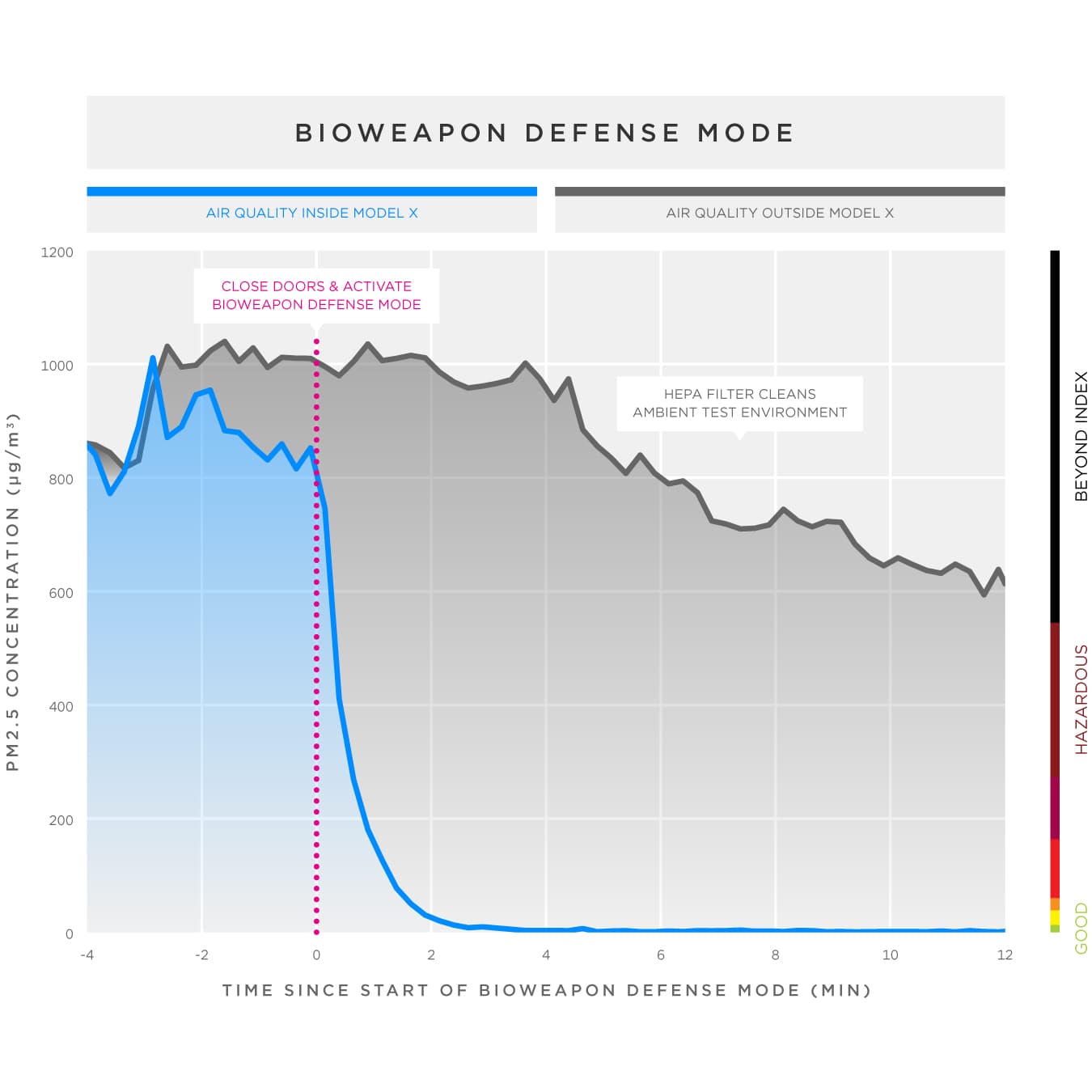 Tento graf je výsledkem testu, který provedla samotná Tesla v roce 2016: „Rozhodli jsme se mód otestovat v prostředí, kde můžeme s velkou přesností ovládat a monitorovat atmosferické podmínky. Model X jsme umístili do velké bubliny, v níž byly extrémní podmínky kvůli znečištění vzduchu (1000 µg/m3 PM2.5 vs. dle EPA limit „dobré“ kvality vzduchu 12 µg/m3). Poté jsme zavřeli dveře vozu a aktivovali Bioweapon Defense Mode.“