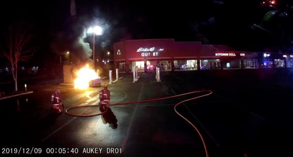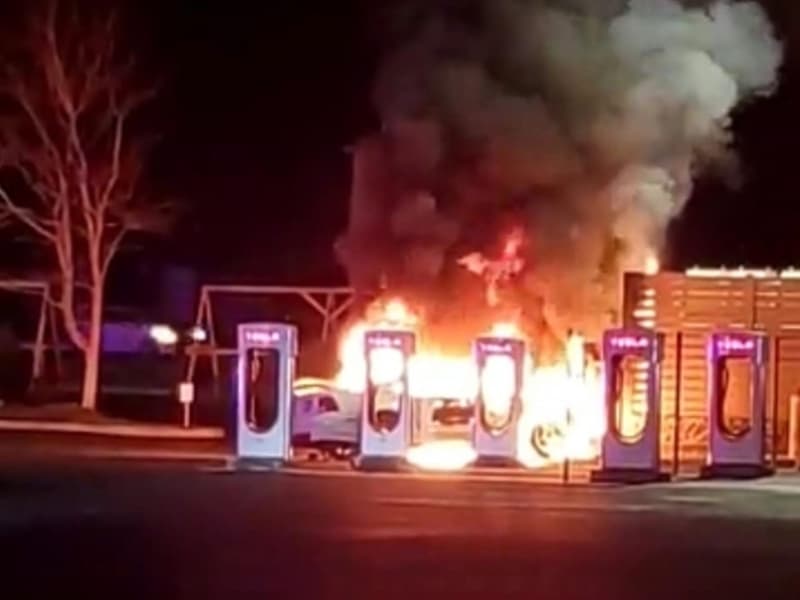 Spalovací auto způsobilo požár na nabíjecí stanici Tesly