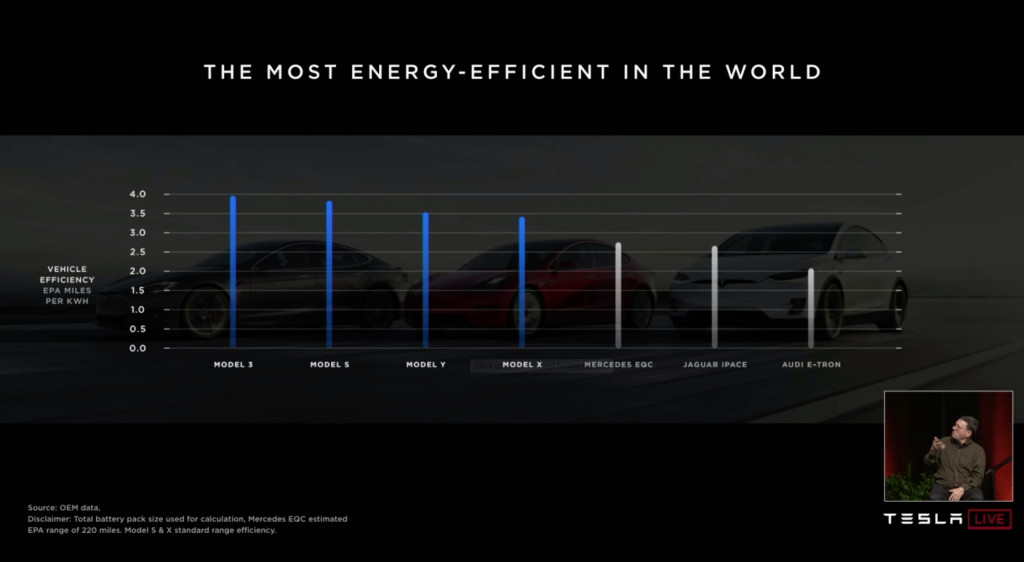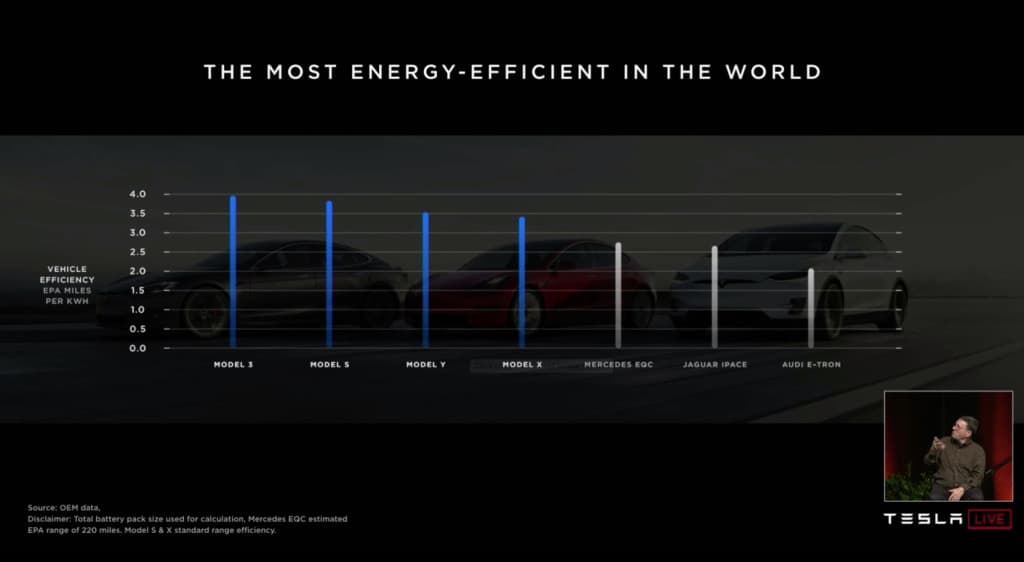 Musk prezentaci vykopl srovnáním efektivity elektromobilů Tesla s konkurencí. Zde je možná na místě trocha kritiky za ne zcela objektivní , protože v grafu není Hyundai IONIQ Electric, který je obecně považován za nejefektivnější současný elektromobil.