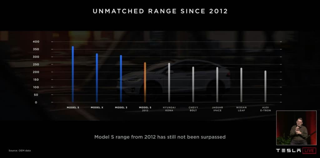 Dále se porovnával dojezd. kde Tesla vede a Musk nezapomněl poznamenat, že je tomu tak už od roku 2012. Po poděkování týmu, který má na starosti vývoj pohonu pak uvedl, že není daleko chvíle, kdy automobilka bude mít elektromobil s dojezdem 400 mil, což je 643 kilometrů.