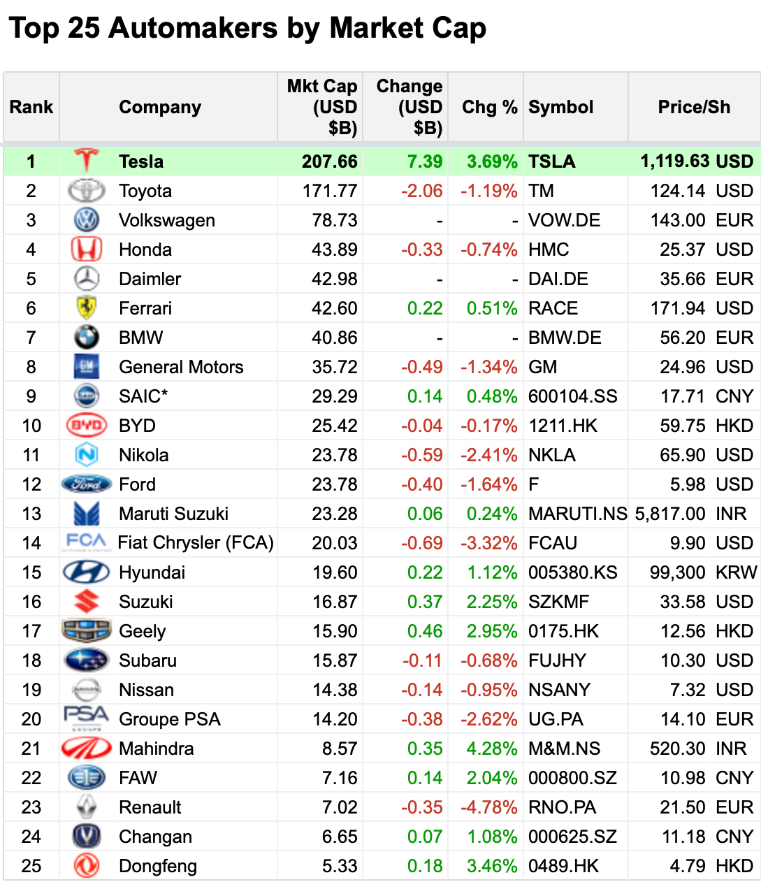 Cena akcií Tesly začala v posledních dnech opět narůstat až dosáhla včerejšího nového maxima 1134 dolarů za akcii. Ale již o něco dříve po překročení tisícidolarové hranice se Tesla opět stala nejhodnotnější automobilkou s tržní kapitalizací přes 200 miliard dolarů. Druhá Toyota má zhruba 170 miliard dolarů a třeba General Motors dohromady s Fordem mají teď už 3x menší cenu na akciovém trhu, než právě Tesla.