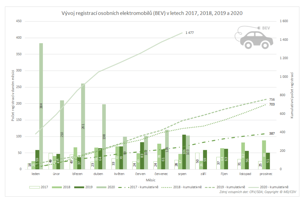 „V uplynulých osmi měsících bylo registrováno 2 467 osobních elektrických vozidel (elektroaut s externím dobíjením), před rokem to bylo jen 744 těchto vozidel. Z uvedeného počtu bylo 1 477 bateriových elektrických (elektromobilů, tj. BEV; 60 %) a 990 plug-in hybridů (PHEV; 40 %),“ uvádí Ing. Jindřich Frič, Ph.D., ředitel Centra dopravního výzkumu.