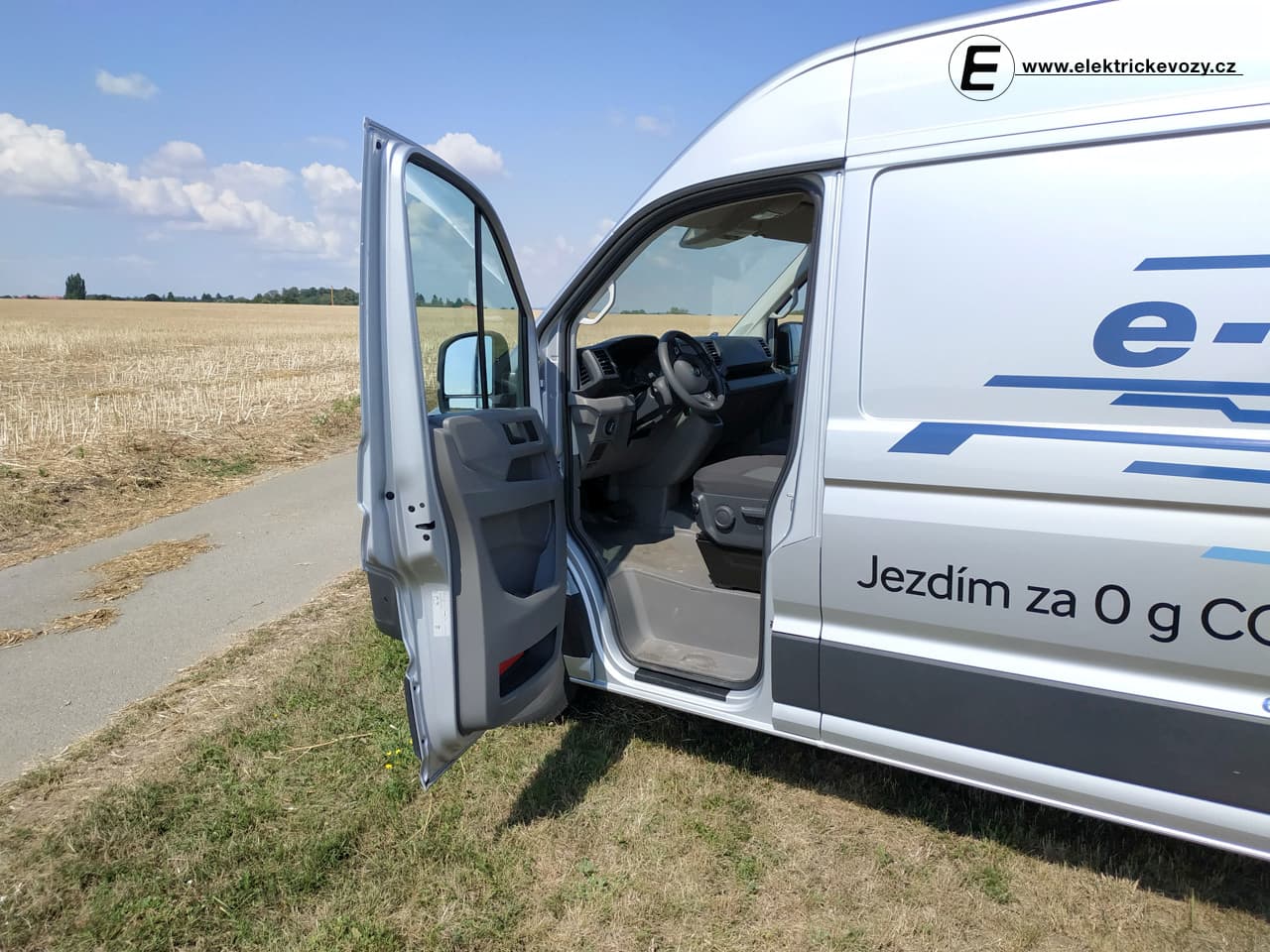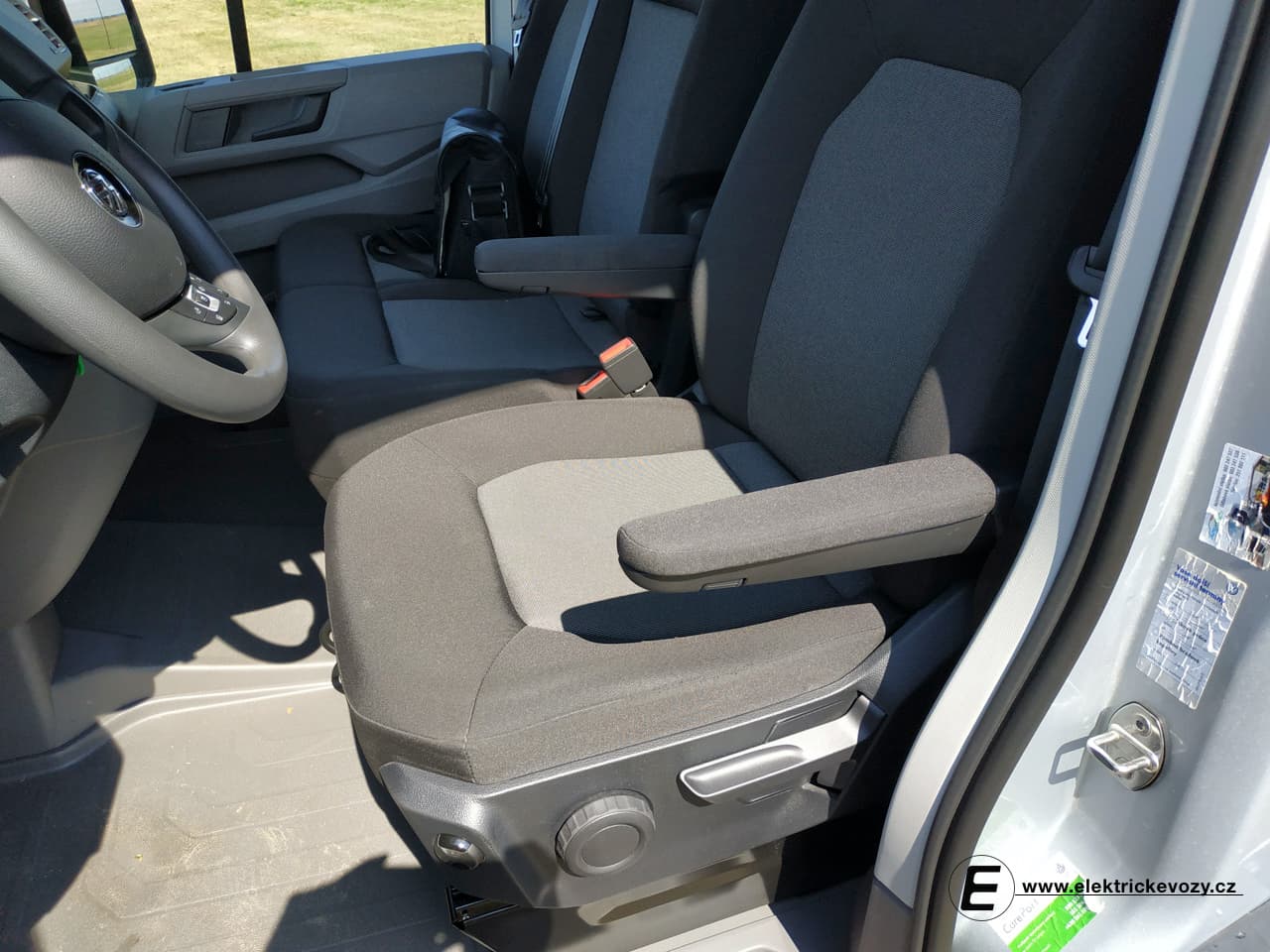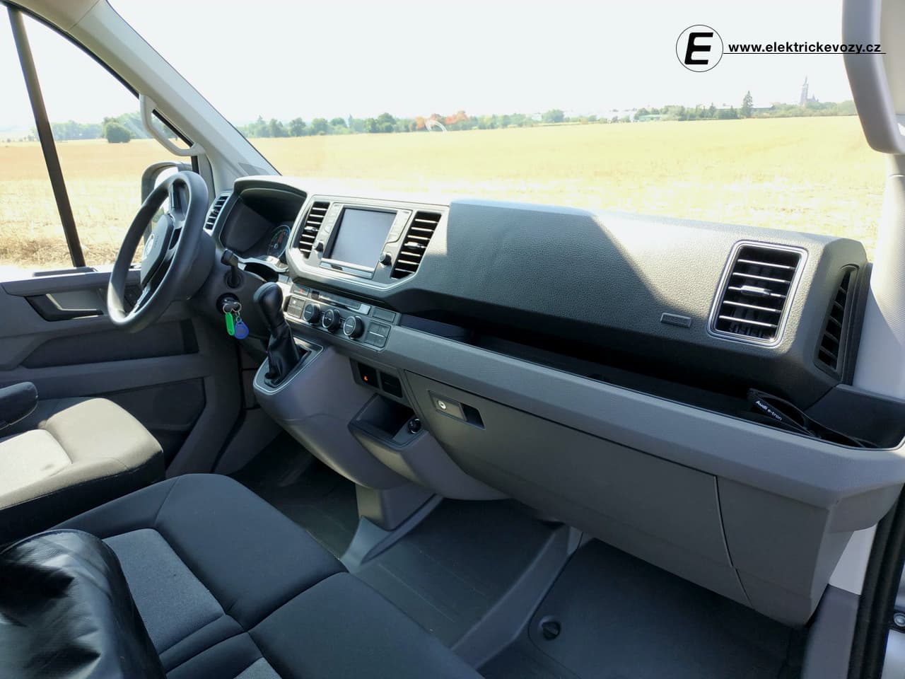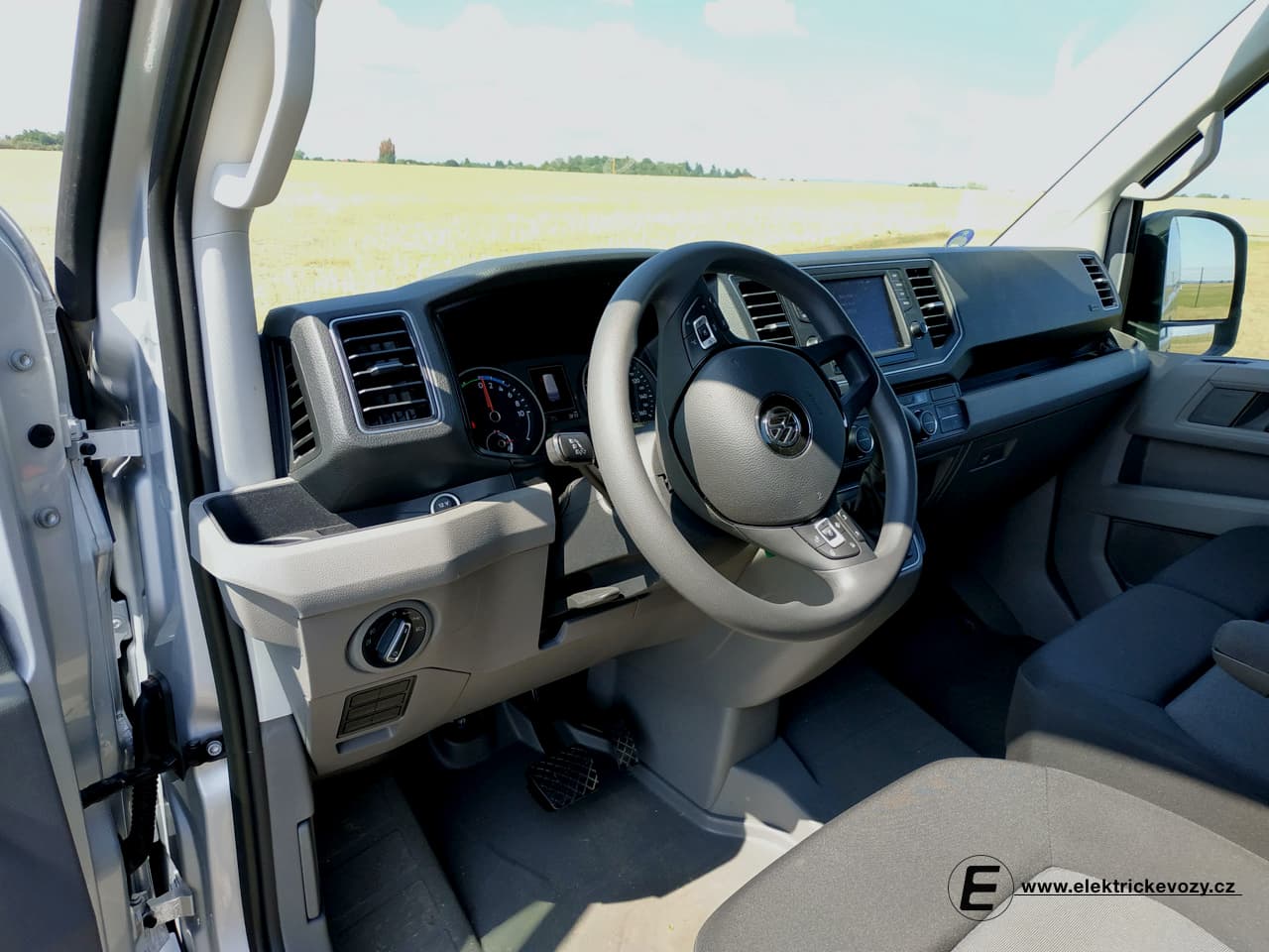 Sedačky jsou v rámci možností pohodlné, díky nastavitelné bederní opěrce jsem neměl problém dokonce ani na delší cestě, k jejímuž popisu se ještě dostanu. Volant a celkově palubní deska připomíná spíše osobák, respektive jsou tyto věci shodné s již dříve testovaným e-Golfem (test). S tím je stejný i infotainment, kde se samozřejmě nic revolučního neodehrává. Navigace, rádio, připojení telefonu přes Bluetooth, zkrátka klasika. Navíc přehledná. Jediná kritika uvnitř je z mé strany k loketním opěrkám. Řidič je má k dispozici na obou stranách, což je sice super, na druhou stranu jsou to nejlaciněji působící opěrky, jaké jsem kdy viděl. Sice se dá nastavit jejich sklon, ale jsou překvapivě úzké a nepohodlné. Jak u většiny automobilové produkce tyto komponenty využívám, tak zde jsem je raději vyklopil zpět do vertikální polohy.