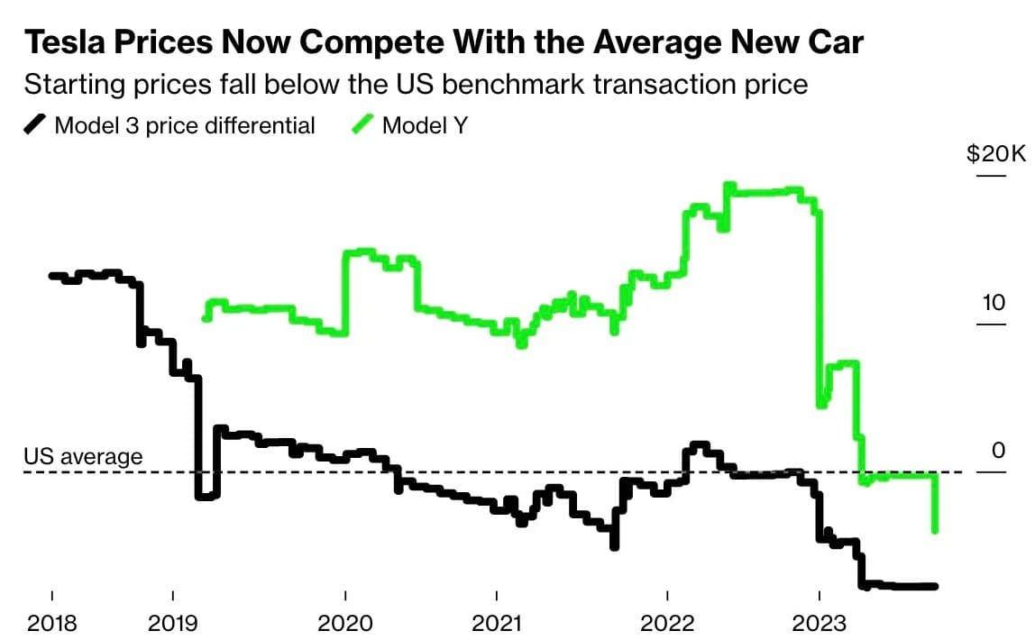 Změnami základních cen vozidel Tesla Model Y a Model 3 a jejich porovnáním s průměrnou cenou nového automobilu v USA se zabývala agentura Bloomberg, která zjistila, že oba elektrické automobily od Tesly nyní začínají pod průměrnou prodejní cenou nového automobilu. Jak můžeme vidět, není to poprvé, kdy základní cena Modelu 3 poklesla pod národní průměr prodejních cen nových automobilů, ale poprvé vidíme, že jak Model 3, tak stále populárnější Model Y mají své ceny pod průměrnou prodejní cenou nového amerického auta.